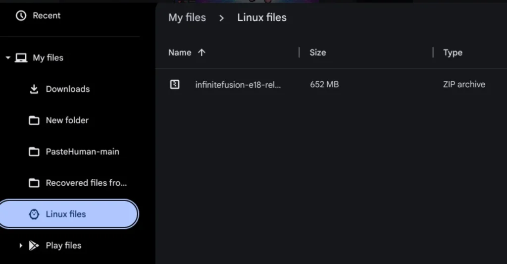 - Move the InfiniteFusion.zip file into your Linux files directory on your Chromebook.